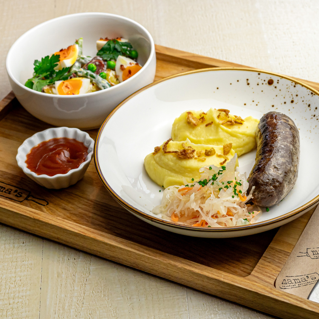 Колбаска из оленины, картофельное пюре, капуста квашеная, лук красный, петрушка, томатный соус