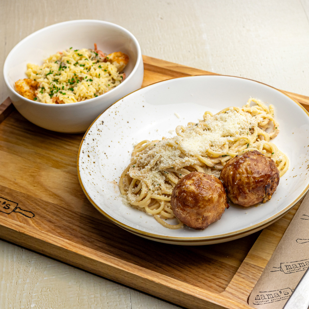 спаггети, тефтели куриные, сливки, сыр пармезан, лук, томатная паста