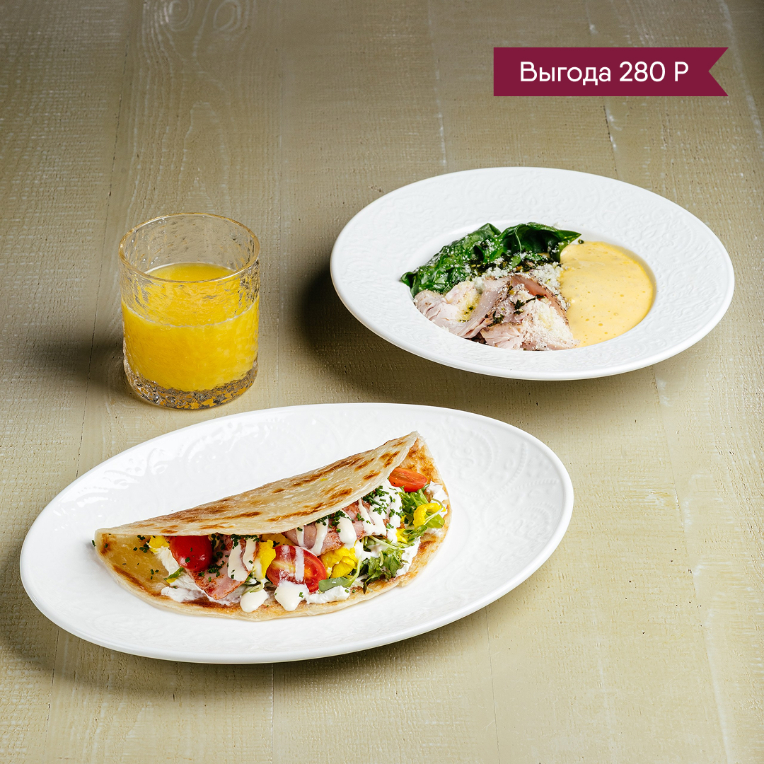 Пшеничная лепёшка, ветчина, омлет, томаты черри, микс зелени, лук шнитт, сливки, творожный сыр, мягкий сливочный сыр