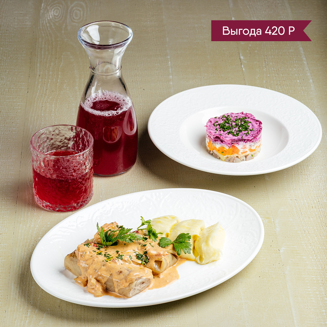 Капустный лист, мраморная говядина, свиная шея, бекон, рис, лук, чеснок, овощной рататуй на сливках, картофельное пюре