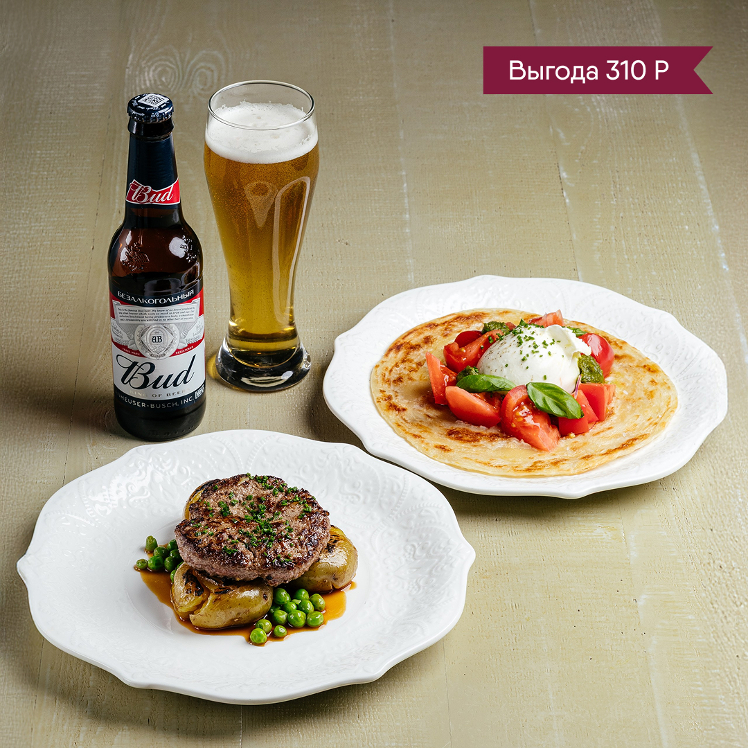 Бифштекс из сочной говядины с мини-картофелем в топлёном сливочном масле, зелёным горошком, свежим луком и фирменным соусом порто