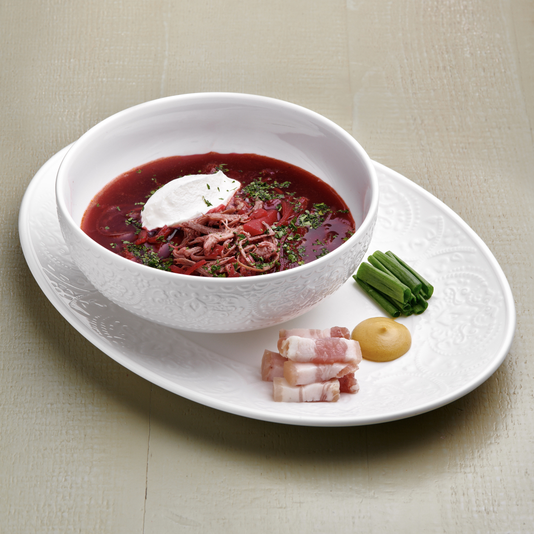 Супы: Говядина, свёкла, морковь, лук, квашеная капуста, мясной бульон, зелень, сметана, горчица, сало, зелёный лук