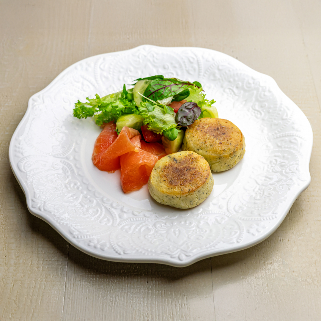 Сырники с зеленью, филе форели, микс зелени, огурец, розовый томат, черный перец, оливковое и подсолнечное масло